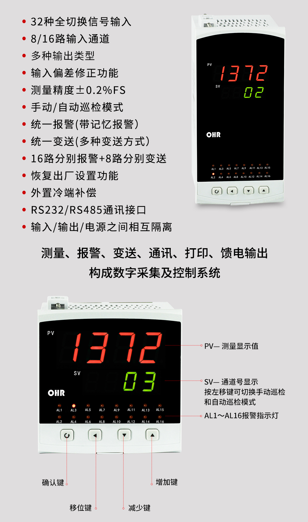 OHR-E702系列增強型多回路測量顯示控制儀針對現場溫度、壓力、液位、速度等各種信號進行采集、顯示、控制、遠傳、通訊、 打印等處理,構成數字采集系統及控制系統,適用于需要進行多測量點巡回檢測的系統。