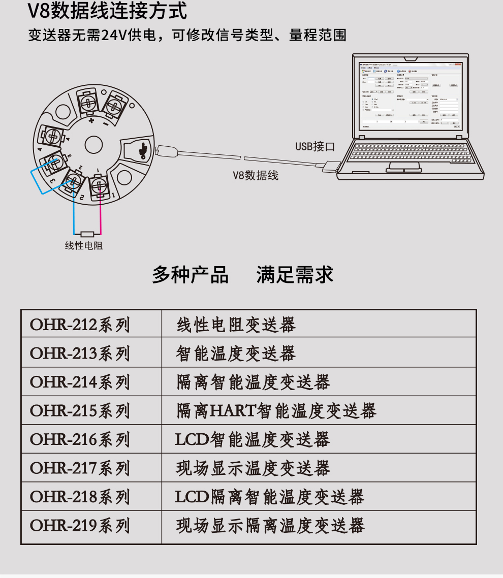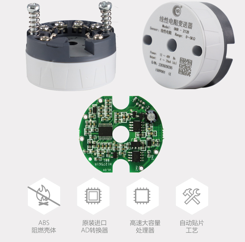OHR-212線性電阻(磁翻板)變送器,用于線性電阻信號輸入,二線制4~20mA模擬輸出,安裝于傳感器內部(Form B)。